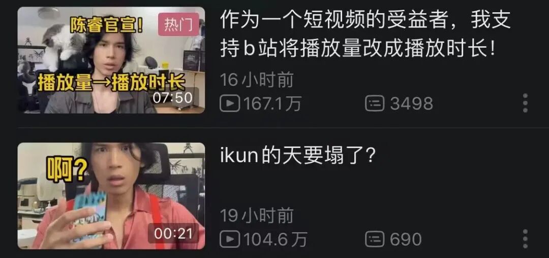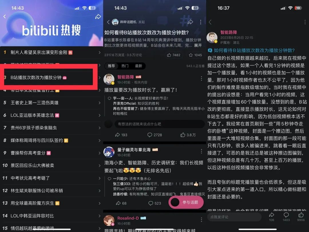 B站相关热搜下,排名最靠前的热门内容,是由UP主@智能路障发布的一条动态,内容很简单:“播放量要改为播放时长了,赢麻了!”这条动态获得了 3.8 万点赞和 2728 条评论。@智能路障在B站拥有 363.1 万粉丝,他曾因为制作“谈鲁迅”系列视频而出圈,并被作家余华称赞“你是我在B站唯一关注的人”。他发布的许多知识类视频时长达 30 分钟以上,属于中长视频。