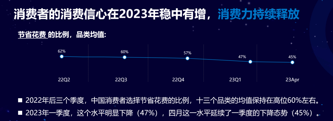 小数字增长的背后,是大数字的水涨船高。去年年底以来,国内消费市场的活力不容小觑。据尼尔森IQ中国电商团队统计数据显示,从2022年底国内经济开始驶入恢复通道后,2023年第一季度中国GDP增速优于全球平均GDP增速2.9%。凯度统计数据也显示,2022年后三个季度,中国消费者选择节省花费的比例,十三个品类的均值保持在高位60%左右。这说明大部分消费者持保守消费的态度。但到了2023年一季度,这个水平明显下降,比例降至47%,四月这一水平延续了下降态势,下降了2个百分点到45%。![]()