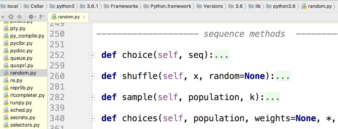 1. 教程里的代码。新手不要急于求成,想一口吃成个大胖子。市面上评分较高的教程书籍,里面的代码都不会太差。认定一本后,从头到尾的示例代码都认真地阅读、理解、运行(要手打不要复制)。这是最简单最有效的方式,然而却并不是人人都能做到。依然有不少人宁愿相信只看几期在线视频就能学会。2. 看官方示例的代码。大多数优秀项目都提供了详尽的文档,包含 Quick Start、Tutorial 之类的新手引导。在学习初期,这些代码就是很好的例子。3. 看编程语言的内置代码。如果你用了趁手的编辑器,可以很方便跳转或直接查看编程语言自身的代码。比如前文截图中就是我们常用的 random.py 的代码,可以从此类单文件代码看起。4. 优秀的第三方库。这类有很多,不过难度对初学者来说可能有一点高,可在进阶时考虑。