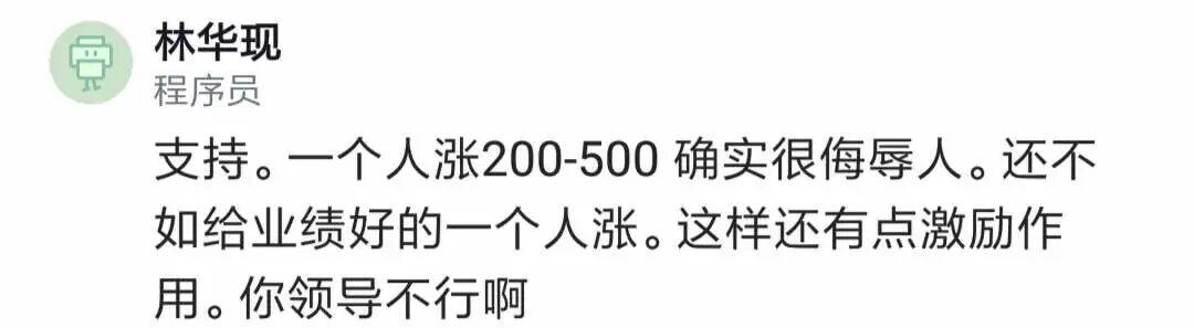 有人说,涨200-500元确实很侮辱人,不如给业绩好的一个人涨,还有点激励作用,这个领导不行。