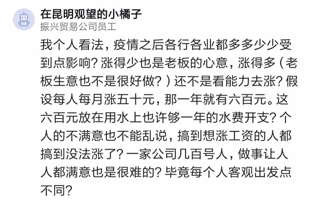 有人说,疫情后各行各业都受影响,虽然涨得少,也是老板的心意。一家公司几百人,做事让所有人都满意也是很难的。