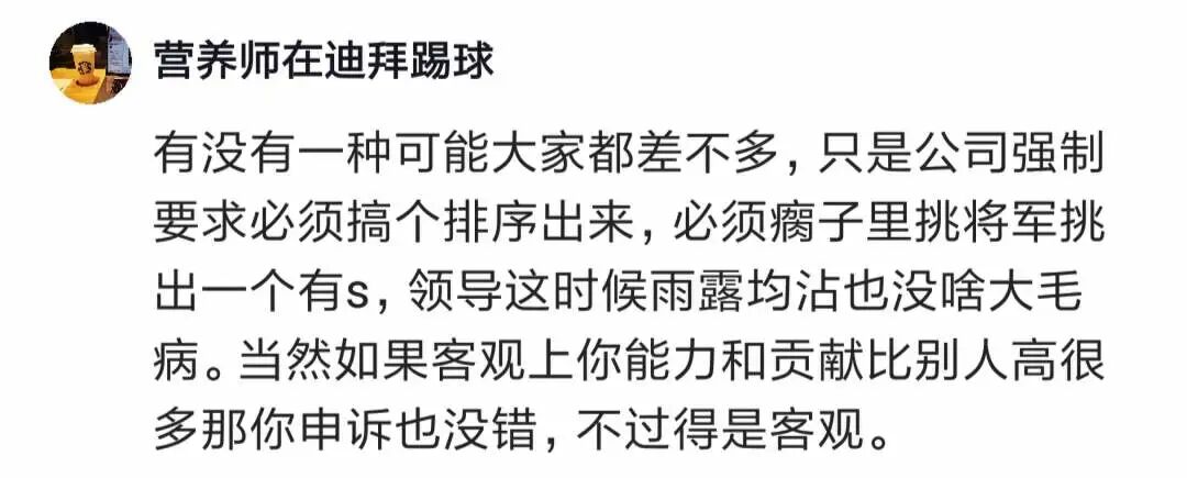 有人说,有没有一种可能,大家都差不多,只是公司强制要求必须排序,所以瘸子里拔将军,挑出一个s,那么领导雨露均沾,也没什么大毛病。当然,如果客观上楼主能力和贡献比别人高很多,那申诉也没错。