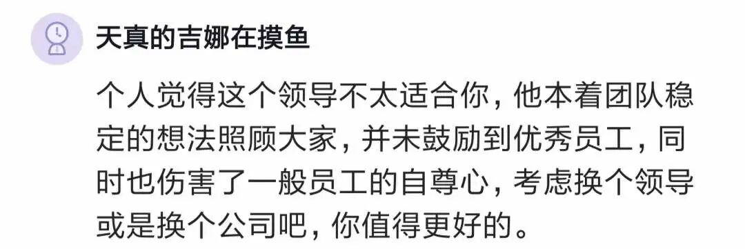 有人说,这个领导本着团队稳定的想法照顾大家,并没有鼓励到优秀员工,同时也伤害了一般员工的自尊心,楼主可以换个领导或者换个公司。