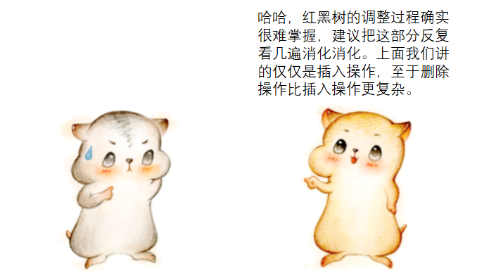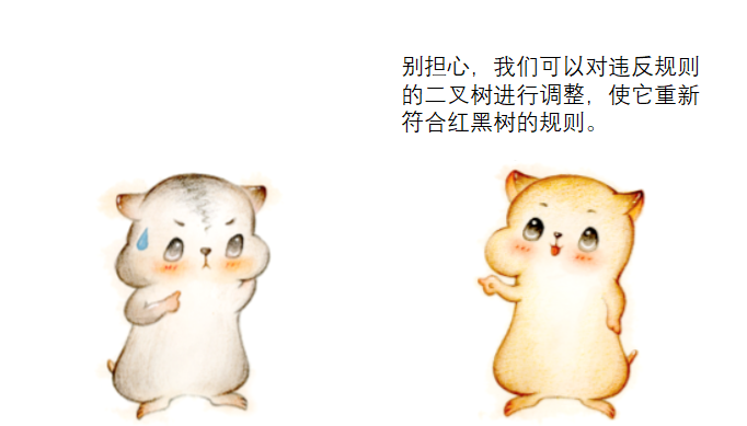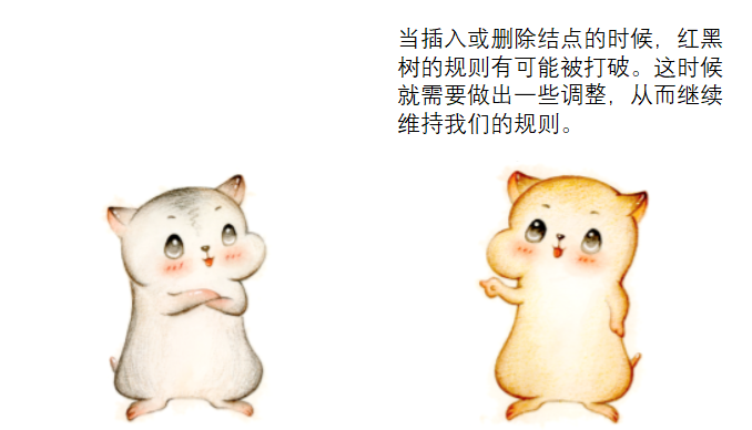 但是,仅仅把一个结点变色,会导致相关路径凭空多出一个黑色结点,这样就打破了规则5。因此,我们需要对其他结点做进一步的调整,后文会详细说明。