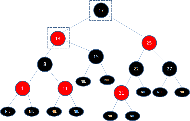于是我们以根结点13为轴进行左旋转,使得结点17成为了新的根结点: