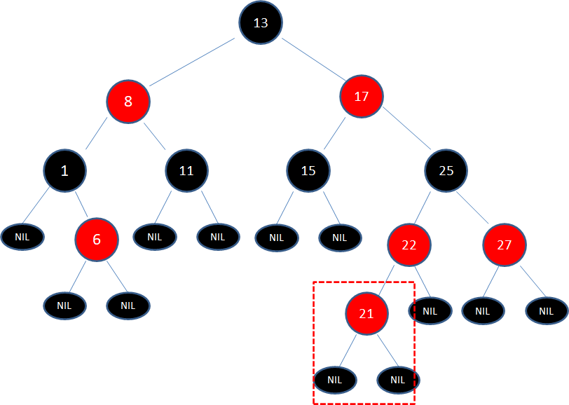 显然,新结点21和它的父结点22是连续的红色结点,违背了规则4,我们应该如何调整呢?