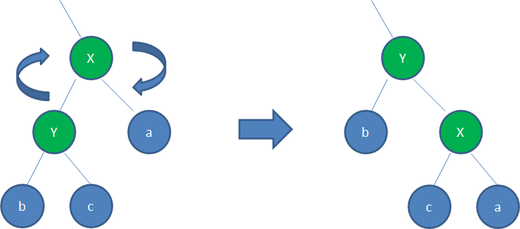 图中,身为右孩子的Y取代了X的位置,而X变成了自己的左孩子。此为左旋转。