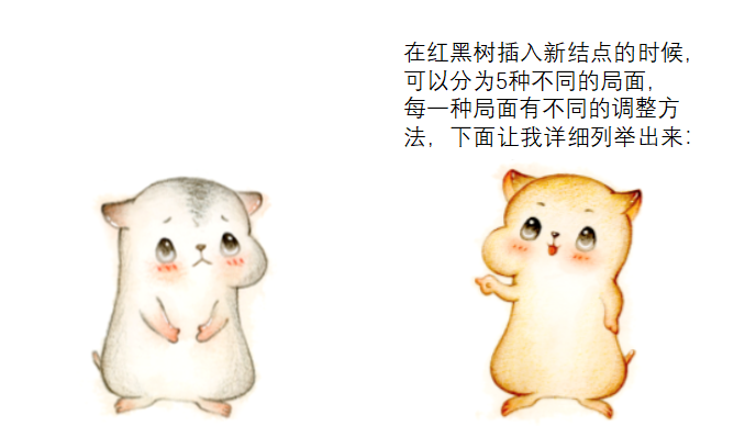 这种局面,直接让新结点变色为黑色,规则2得到满足。同时,黑色的根结点使得每条路径上的黑色结点数目都增加了1,所以并没有打破规则5。