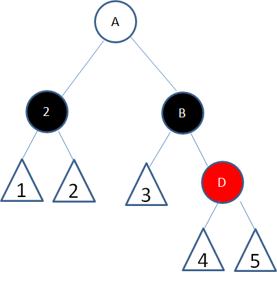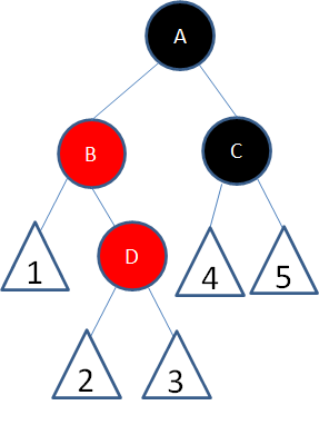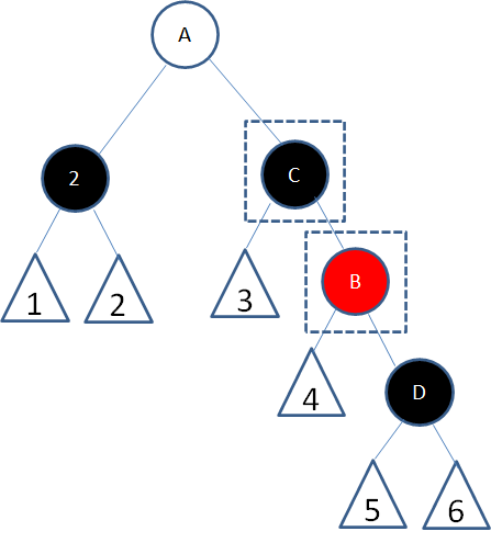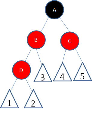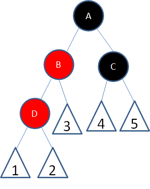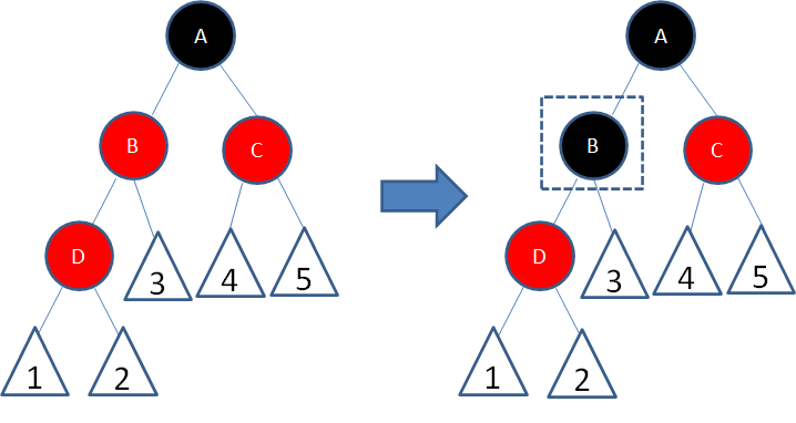这种局面,两个红色结点B和D连续,违反了规则4。因此我们先让结点B变为黑色: