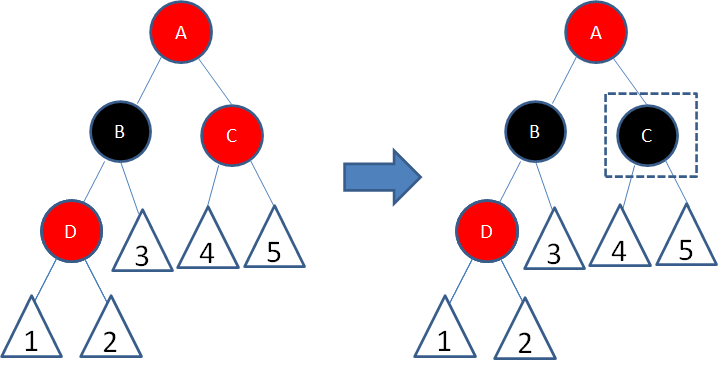这时候,结点A和C又成为了连续的红色结点,我们再让结点C变为黑色:
