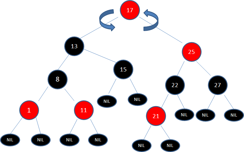 经过上面的调整,以结点25为根的子树符合了红黑树规则,但结点25和结点17成为了连续的红色结点,违背规则4。