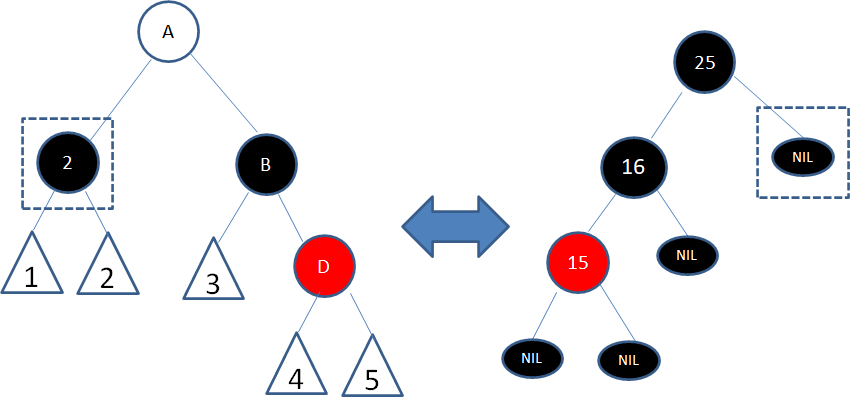 这样一来,原本结点2所在的路径少了一个黑色结点,现在结点B所在的路径也少了一个黑色结点,两边“扯平”了。