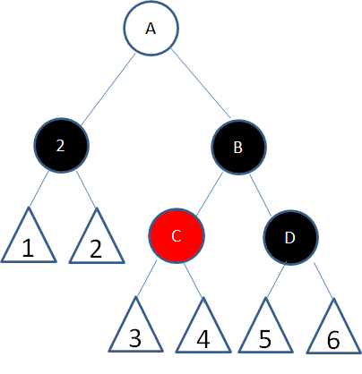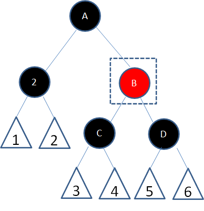 这样一来,结点B所在路径凭空多了一个黑色结点,打破了规则5。因此我们让结点A变为红色: