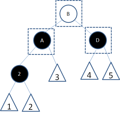 局面5:新结点(D)的父结点是红色,叔叔结点是黑色或者没有叔叔,且新结点是父结点的左孩子,父结点(B)是祖父结点的左孩子。