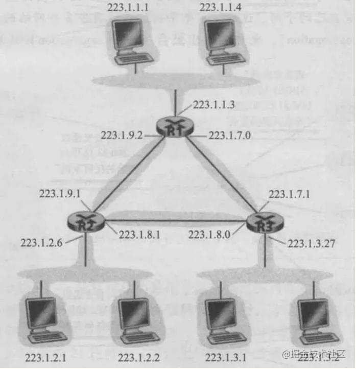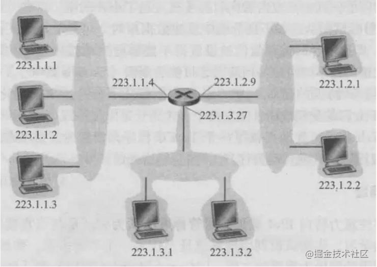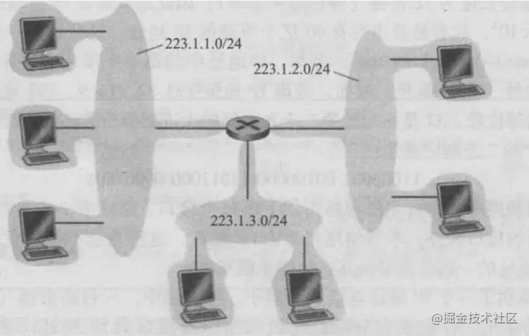 任何连接到该子网的主机都要求其地址具有223.1.1.x 的形式。同样图中下侧和右侧也是子网,分别为 223.1.3.0/24 和 223.1.2.0/24