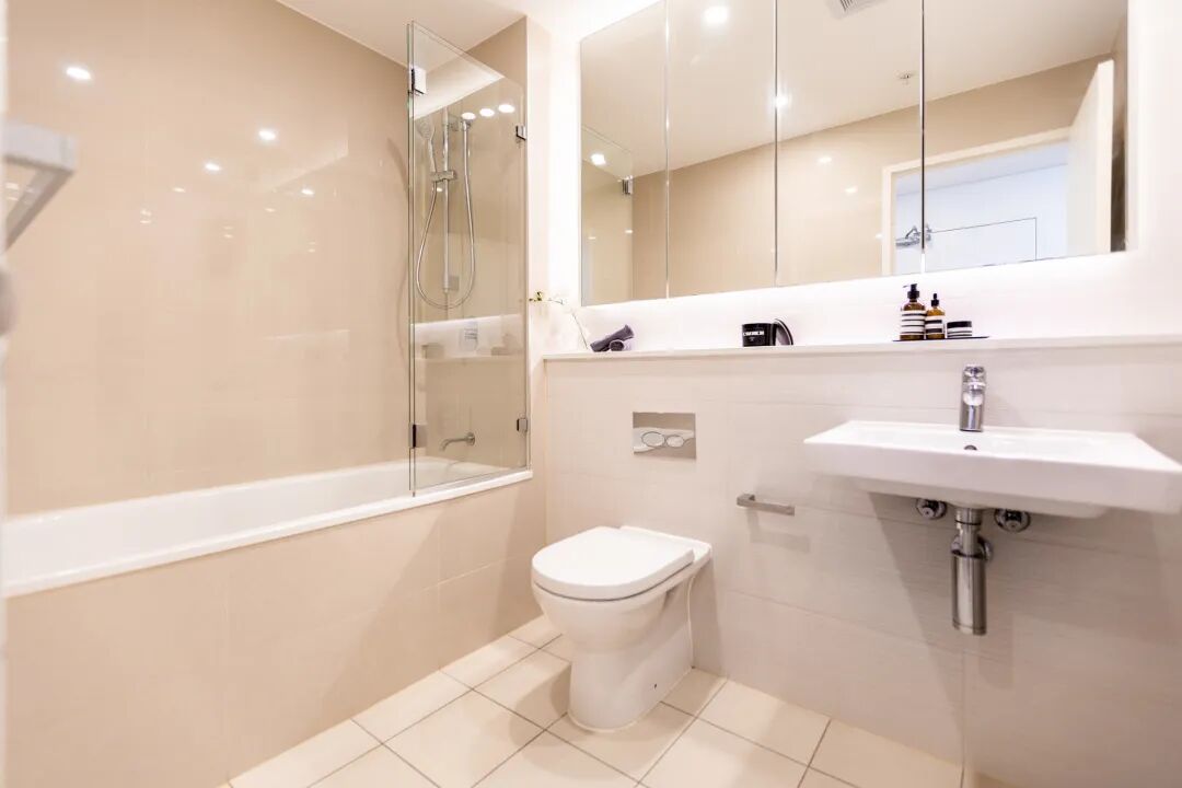 卫生间的装饰风格有深色和浅色两个色系,但设置基本相似,入墙式悬挂马桶带来的半高平台上可搁置牙刷牙杯、洗手液等常用物品,一大排镜柜则足以满足日常的储物需求。全面墙的瓷砖也让未来业主在打扫的时候更轻松,且不易发霉。
