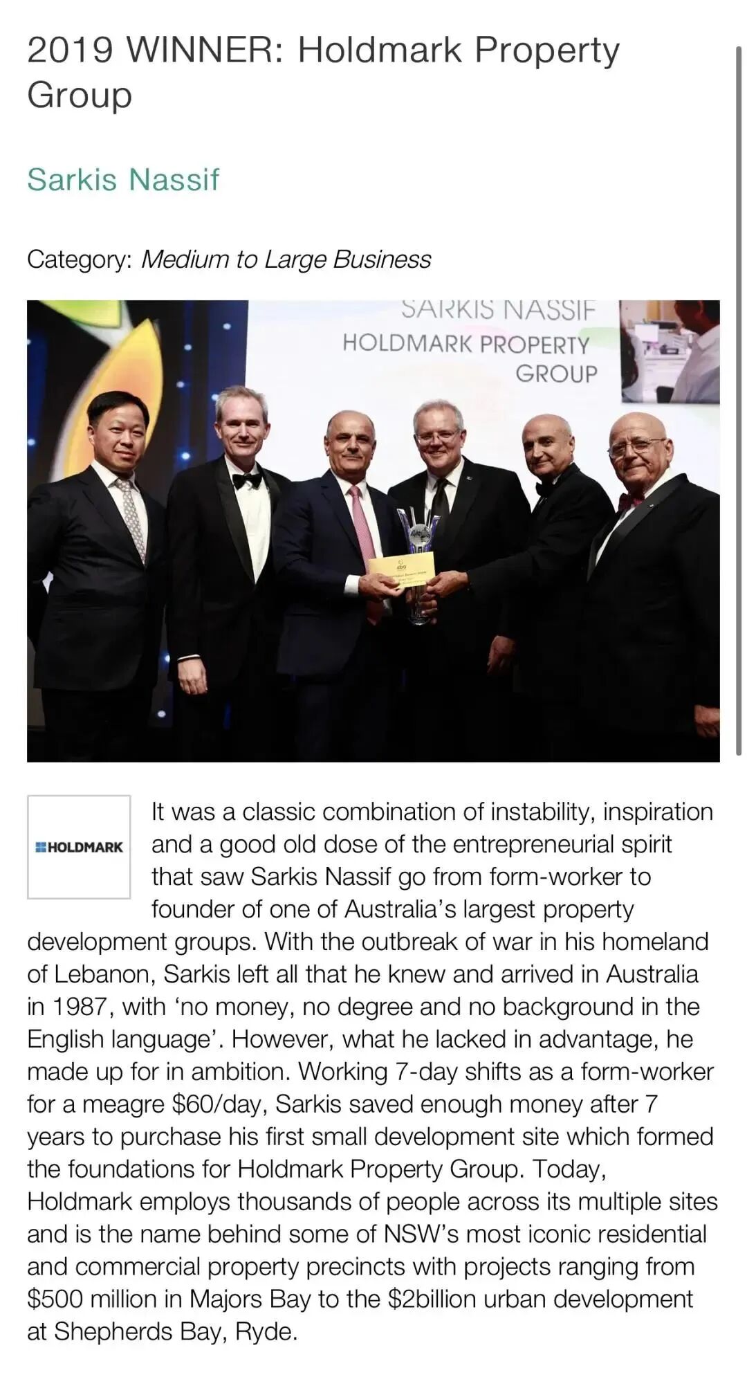 由于杰出的规划对当地社区做出的杰出贡献,Shepherds Bay项目的开发商还在2019年荣膺由时任澳洲总理斯科特·莫里森亲手颁发的“良心企业”奖,该奖项始于三十多年前,是澳大利亚历史最悠久、最负盛名的商业奖项,旨在表彰新移民所创办的企业为澳洲做出的贡献。可以看出,澳洲政府对于Holdmark在悉尼城市建设中做出的杰出贡献表示感谢,也代表澳洲政府对Shepherds Bay项目的赞赏。
