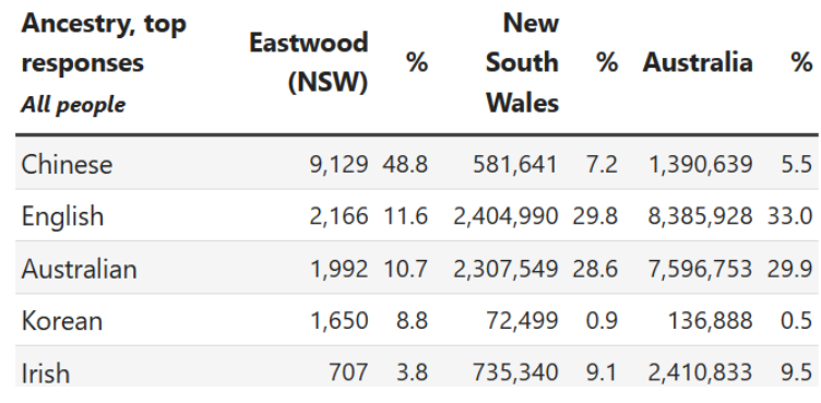 2021年澳洲人口普查数据显示,Eastwood居民中超过9000人具有华人背景,占当地人口总数的48.8%且排第一;