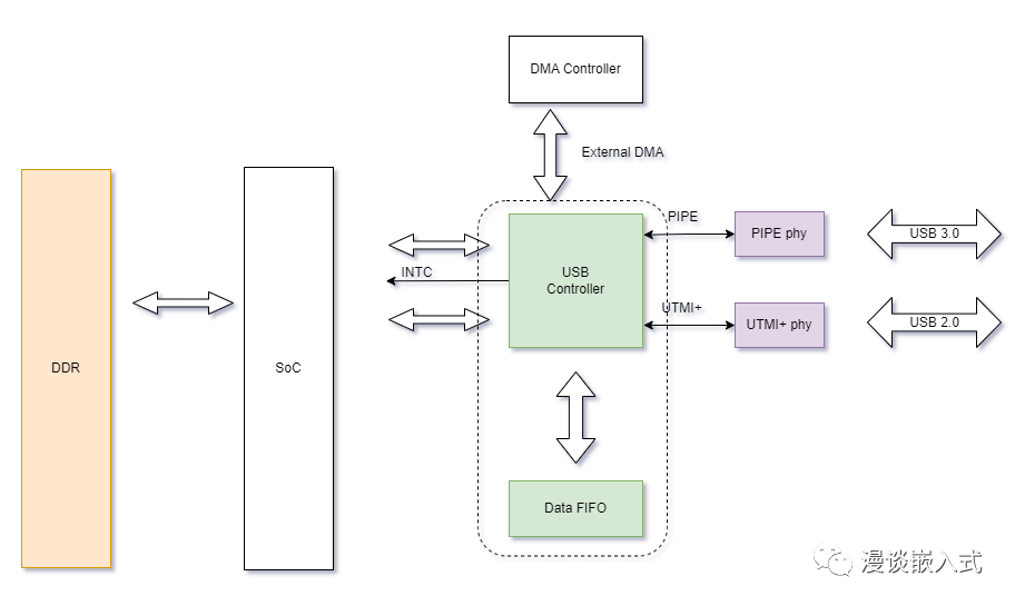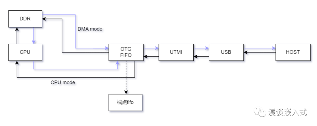 接口数据:host 到来的数据,经过usb phy 经utmi 接口转换,到usb 控制器的端点FIFO,然后通过cpu 或者dma 模式搬运到DDR
