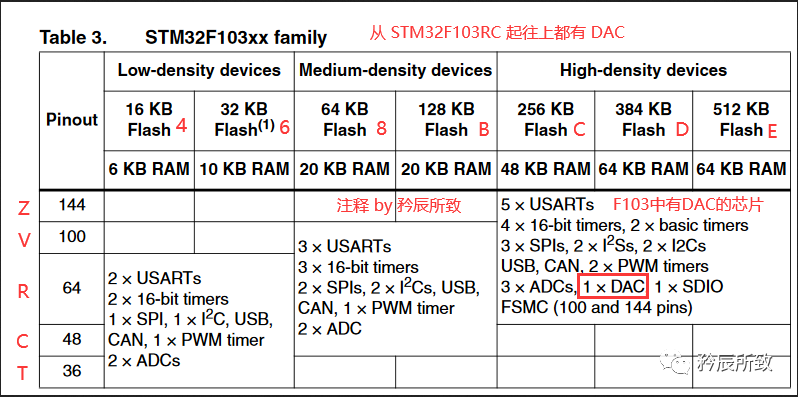 STM32F103 系列带有 DAC 的型号如下图列表所示(从 STM32F103RC 起往上都有DAC):