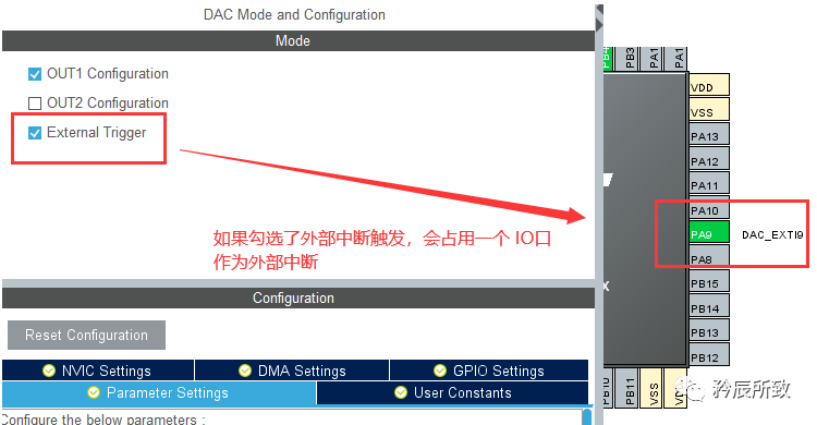 选择两个输出通道,其中 External Trigger 选项为是否选择 外部中断EXTI9 触发,如下图所示: