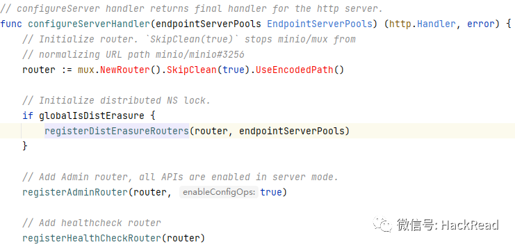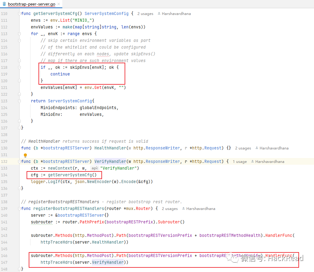 // minio/cmd/bootstrap-peer-server.gofunc (b *bootstrapRESTServer) VerifyHandler(w http.ResponseWriter, r *http.Request) {ctx := newContext(r, w, "VerifyHandler")cfg := getServerSystemCfg()logger.LogIf(ctx, json.NewEncoder(w).Encode(&cfg))}// minio/cmd/bootstrap-peer-server.gofunc getServerSystemCfg() ServerSystemConfig {envs := env.List("MINIO_")envValues := make(map[string]string, len(envs))for _, envK := range envs {// skip certain environment variables as part// of the whitelist and could be configured// differently on each nodes, update skipEnvs()// map if there are such environment valuesif _, ok := skipEnvs[envK]; ok {continue}envValues[envK] = env.Get(envK, "")}return ServerSystemConfig{MinioEndpoints: globalEndpoints,MinioEnv: envValues,}}