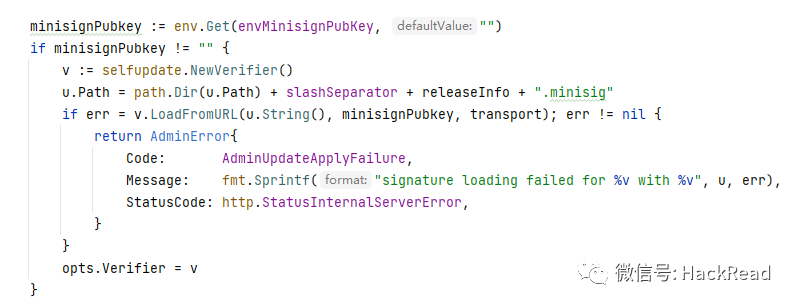 而在verifyBinary中envMinisignPubKey环境变量应该是默认为空,导致签名校验无效。