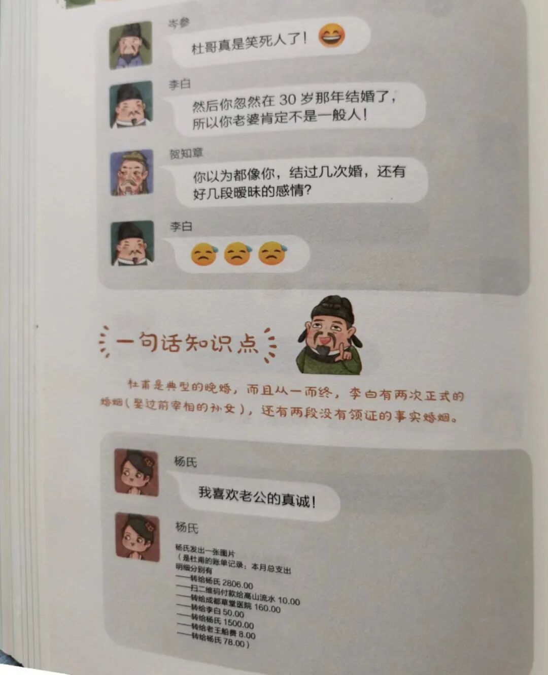李白:然后你忽然在30岁那年结婚了,所以你老婆肯定不是一般人贺知章:你以为都像你,结几次婚,还有好几段暧昧的感情?杜甫是典型的晚婚,而且从一而终,李白结过两次婚(都是前宰相的孙女),还有两段没有领证的事实婚姻。![]()