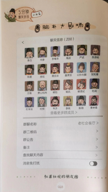 “在这清冷的月夜里,兄弟们,你们都在哪里?我好想寄封书信去问一问你们平安与否?”“在和平年代,山水阻隔尚且不能时常通信,又何况现在这个战乱不断的时候?”群成员:杨氏,李白,岑参,李龟年,高适,严武,苏源明,郑虔,房琯,唐玄宗,唐肃宗,公孙大娘,贺知章,王维,杨怡,杨贵妃,杜闲,杜审言,杜预,韦济,李宪(李琎的父亲),张垍,李林甫,杨国忠,安禄山,李邕,崔国辅,杜佐,卫八处士,孔巢父,杜甫二姑,生母崔氏,继母卢氏![]()