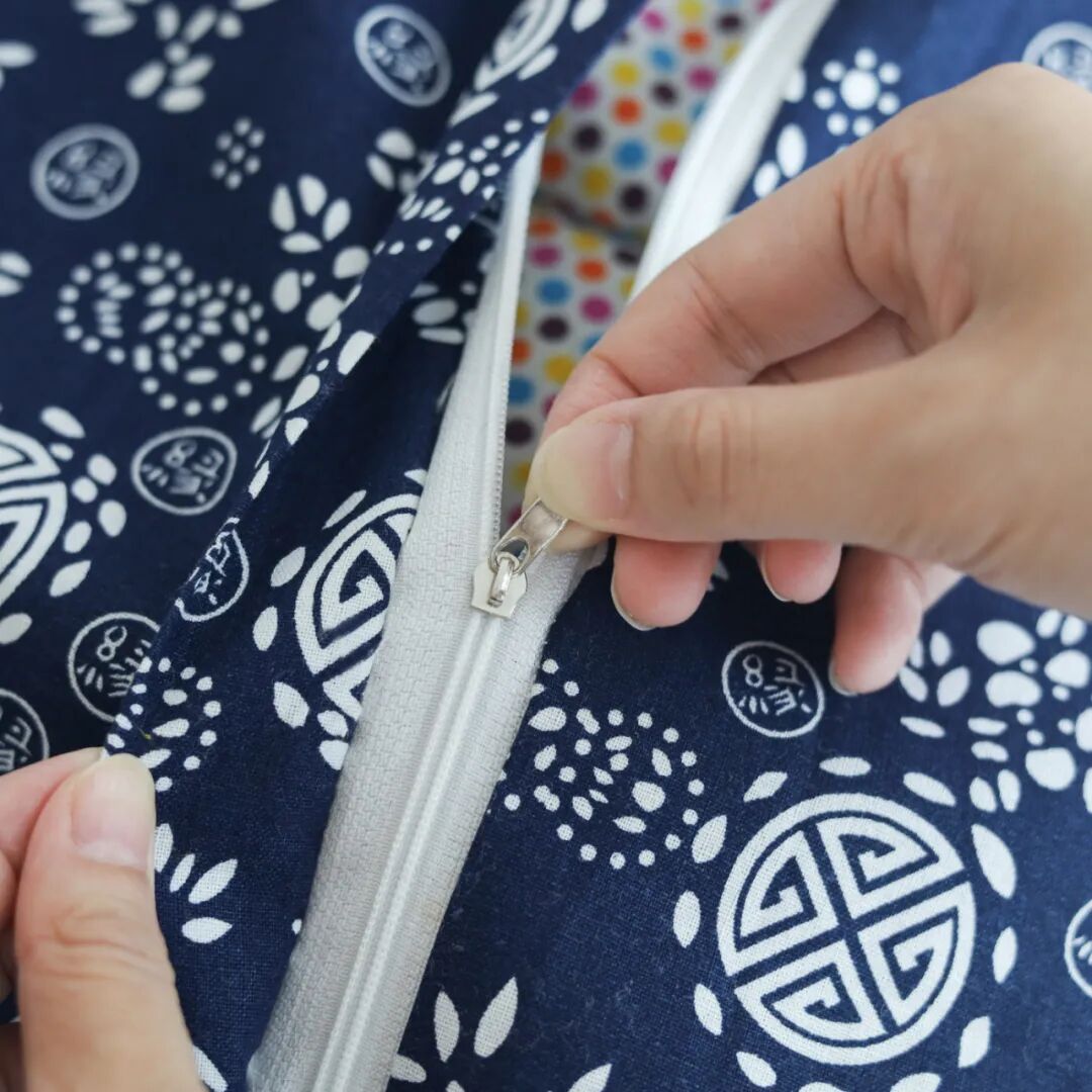 再将它厚厚地装填到手工缝制的内胆布里,拍打均匀,缝制16宫格走线。