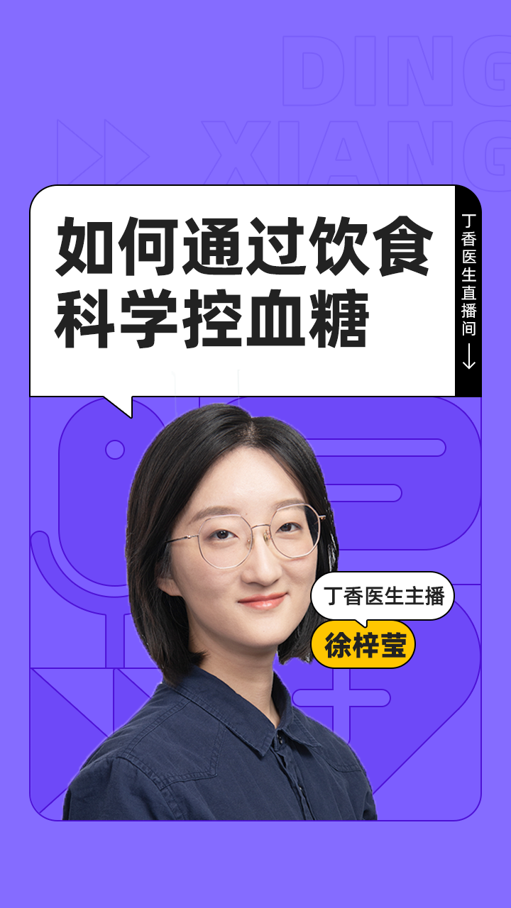 今晚 20:00 点,丁香医生直播间,徐梓莹老师将一起跟大家聊聊《怎样吃走高血糖》的话题,我们不见不散!