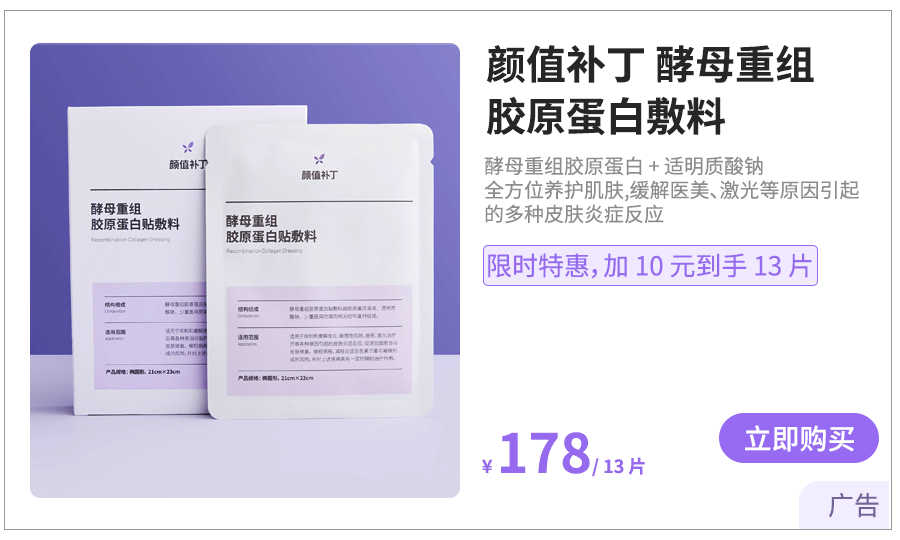 而颜值补丁里添加的专利成分「酵母重组胶原蛋白」,就像是皮肤的疗愈水晶。(专利名称:基因重组人胶原蛋白,专利证书号:ZL 2013 1 0033299.6,发明专利号:ZL 2013 1 0033299.6)。