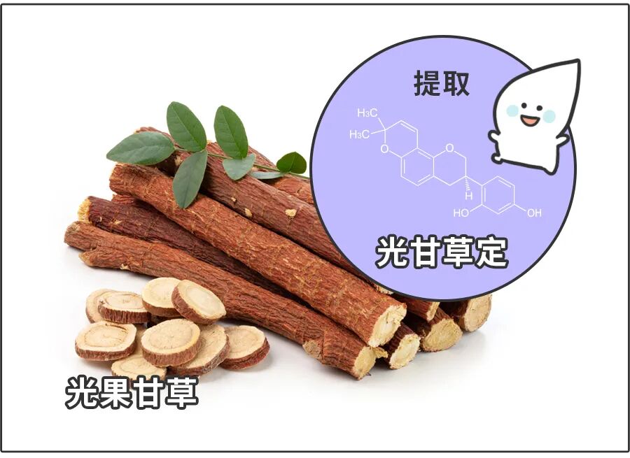 光甘草定,源自于光果甘草(也就是大家熟悉的甘草中的小分支)的根部,是一种只能从植物中提取、无法通过化学合成的美白活性物。