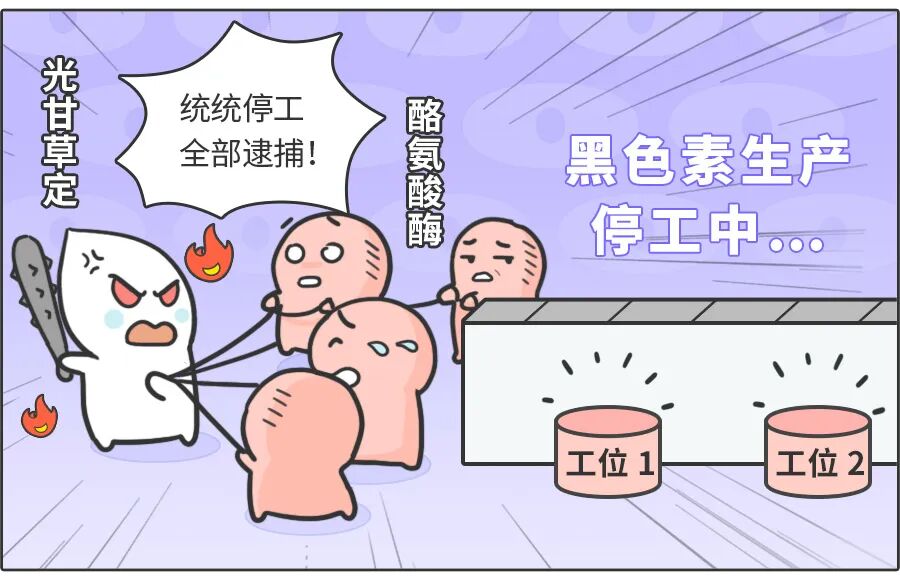 与烟酰胺半路拦截黑色素的策略不大一样,光甘草定选择「擒贼先擒王」,让催化黑色素的幕后黑手——酪氨酸酶停工,不发挥作用,从源头抑制黑色素生成,以达到美白功效[1]。