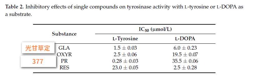 另外,在实验条件下,光甘草定对酪氨酸酶抑制率是大热美白成分 377 的 6 倍左右,并优于白藜芦醇(OXYR)抗氧化成分[3]*。
