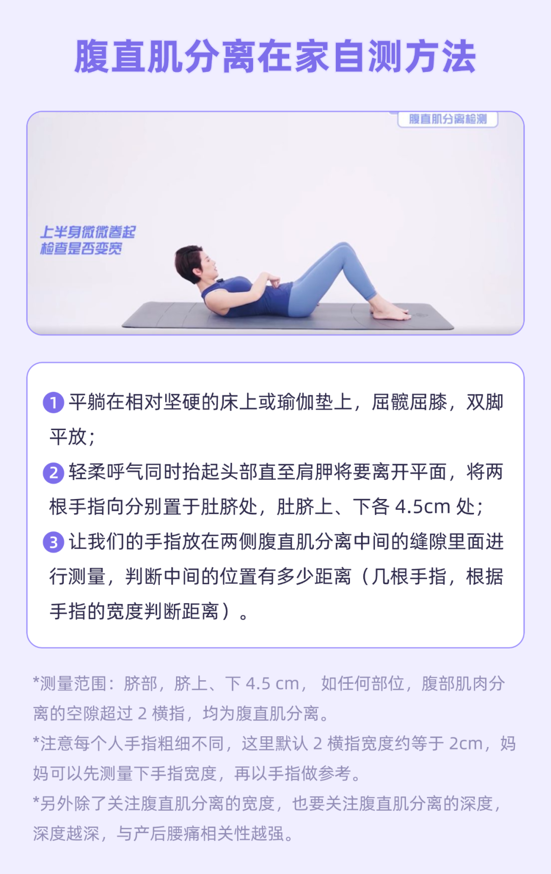 妈妈们也可以选择在家自测腹直肌的分离程度,脐部,脐上、脐下 4.5 cm 处如任何部位超过 2 cm,均为腹直肌分离。
