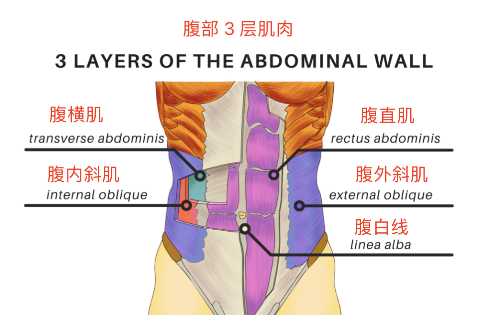 我们的腹部肌肉分为相互交错的 3 层,从内而外分别是:腹横肌、腹内外斜肌、腹直肌。
