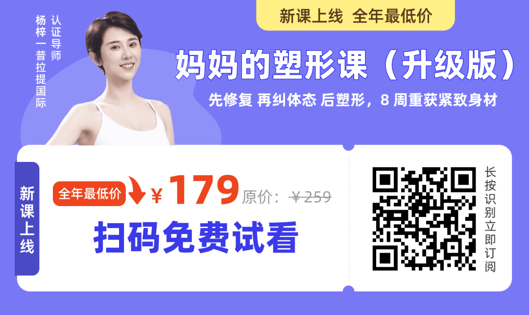 如果你希望看到更多更完整的产后修复视频,推荐你一定要去看看今天的第二篇文章,国际认证普拉提教练杨梓老师,给产后妈妈带来一套完整的产后修复塑形方案,杨梓老师亲自录制、讲解,千万别错过。