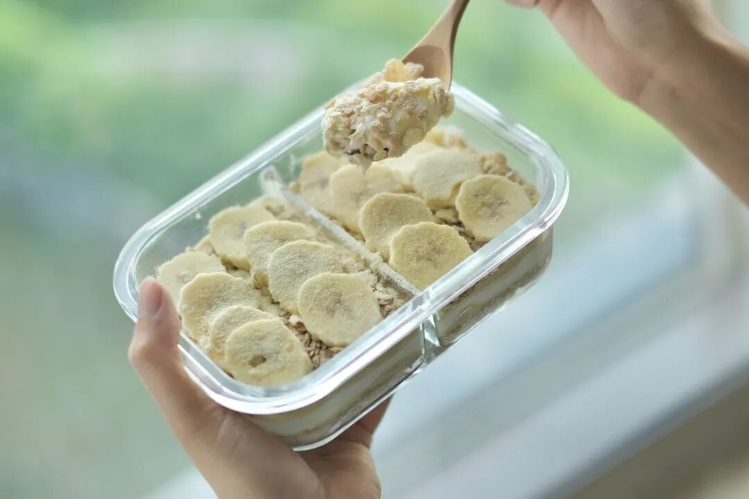 在透明保鲜盒里,一层青稞脆片,一层酸奶,一层豆浆粉,重复叠加。