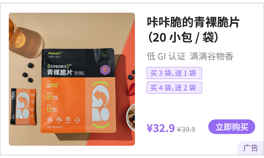 为了让大家吃得安心,我们对青稞脆片还专门进行了检测。结果显示青稞脆片的 GI 值 ≤ 55,妥妥的低 GI,也就是升糖指数低。