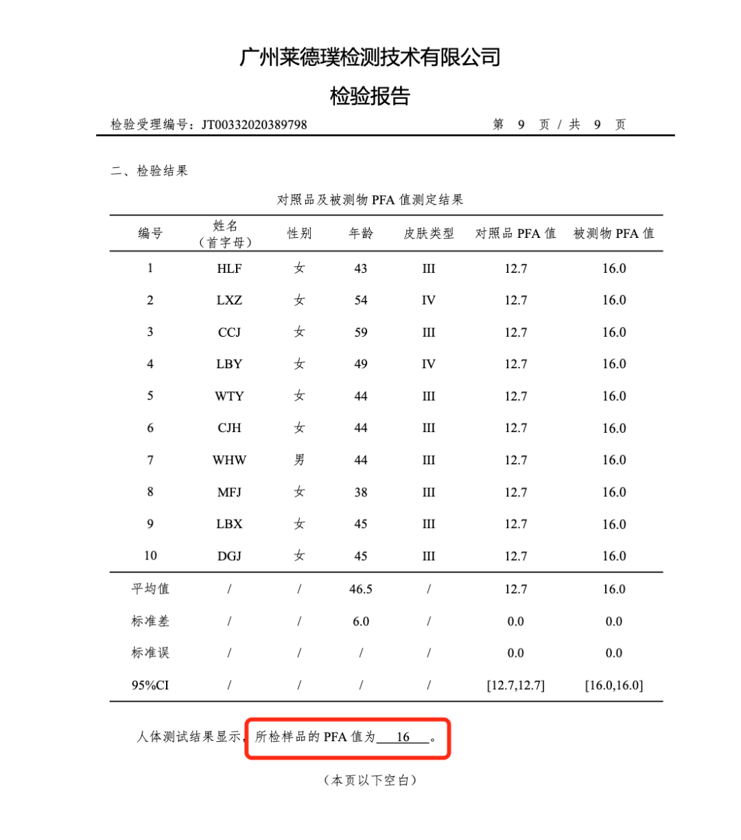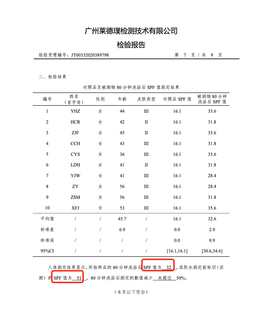 据《广州莱德璞防水测试报告》显示:使用大橙瓶 80 分钟洗浴后 SPF 值 32。