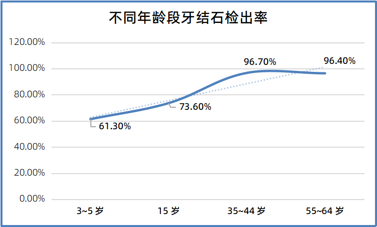 随着年龄增长,牙结石检出率也越来越高,15 岁人群中,牙结石检出率高达 73.6%;35~44 岁人群,牙结石检出率高达 96.7%。
