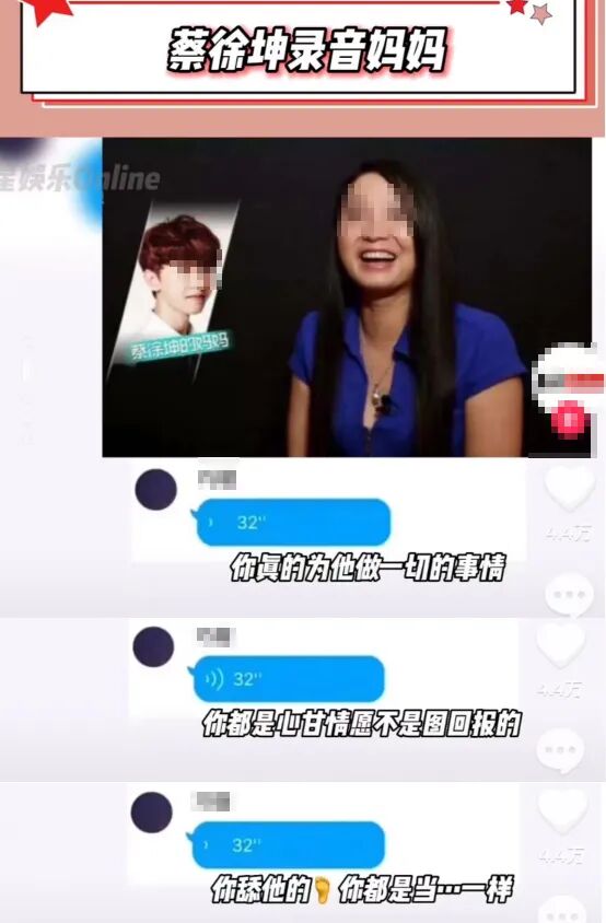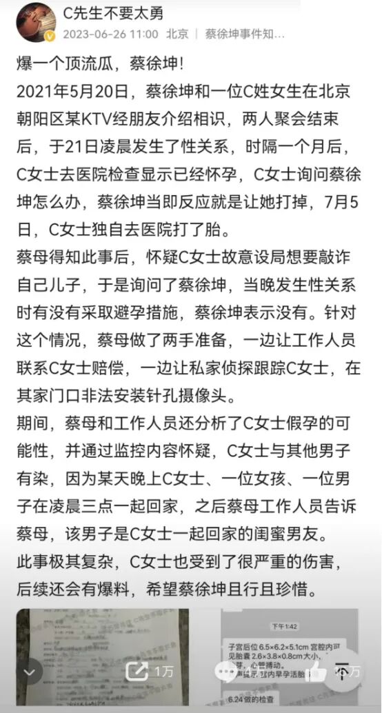26日上午,一个叫“C先生不要太勇”的账号突然发布了一条消息。指名道姓地点出,男顶流与女子C女士一夜风流之后,导致女子怀孕,他当即就让她去打胎。她向儿子确认是否真的没有采取措施,在得到肯定的回答后。她一边让工作人员联系C女士,希望对方打胎,并承诺给予一定的赔偿。一边让私家侦探跟踪C女士,在她家的门口安装针孔摄像头。2021年7月,对于顶流男星团队来说,是个忙碌的时间段。网上流传出疑似顶流男星母亲和团队工作人员的聊天记录里,就C女士怀孕的事宜进行了详细的讨论。一:C女士是否真的怀孕?胎儿发育的时间能对得上吗?二:C女士的检查单是真的吗?路径来源是否属实?还要向医院的主治医生确认。三:如果检查单属实,那么这个做检查的人是否确定是C女士,而不是她朋友或者其他?整个讨论的过程,详细精确,过程漫长,就为了弄清楚,孩子到底是不是顶流男星的。说真的,顶流男星除了亲自“作案”之外,其他的事件均由其他人代劳。2021年7月18日,顶流男星母亲开始考虑赔偿事宜。在一段疑似顶流男星母亲和工作人员的电话电话录音中,其母提出:赔偿50万给C女士,但不要一次性给那么多,因为现在彼此都没有信任感了。很明显,是为了掌握C女士的证据,以防日后她反悔,顶流男星的团队可以进行反击。C女士半夜3点带了一个男士和一名女士回家,蔡团队怀疑C女士跟那名男士有染。C女士发现了门口的针孔摄像头,于是和顶流男星那边发生了冲突,双方闹到了警局。后来,这个惊天大瓜被狗仔爆出来后,一下子引爆了热搜,引发全网讨论。一时间,顶流男星“清纯少爷”的人设剧烈崩塌,毁到渣都不剩。如果是假的,按照以往娱乐圈的惯例,早就报警或者律师函警告,但目前没有任何回复,说明这里面还是有一些端倪。但我们无法确认这件事是否百分之百属实,唯一可以确定的是,顶流男星团队已经失去了公关的黄金时期。不知道你有没有发现,这几年,娱乐圈的“塌房”事件越来越多?在粉丝面前表现得纯情的大男孩,背后可能是个不负责任、男女关系混乱的大渣男;立下清纯人设,看起来无辜的美少女,背后可能脏话连篇、对自己的孩子都冷漠无情。去年因偷税漏税被封杀的邓伦,需要补交的税就高达1.06个亿。而连非流量明星的王传君,都说过自己最穷的时候卡里只有100万。作为偶像,只要颜值在线,跟粉丝们多互动,就能引发一阵阵尖叫,让无数人为他们的产品、周边、演唱会门票买单。作为演员,他们根本不需要什么演技,只需要动动嘴唇,做做表情,一部戏就能蒙混过关,上千万的片酬就能到手了。唾手可得的金钱,召之即来的名气,不断追随的吹捧,让他们产生了一种错觉:只要我想,任何人都要听我的,任何东西我都可以轻松得到。于是,他们利用自己的名气、颜值,随随便便地对待每一场男女关系,在感情的世界里肆意伤害人;他们利用自己手中的资源,漠视法规纪律,嫖娼,吸毒……累累罪行,罄竹难书。因为他们知道,即使自己践踏了底线,还是会有疯狂的粉丝冲他们尖叫、欢呼,团队不管怎么样都会为他们善后、托底。以前的电影明星们,会称喜欢看他们电影的人为“观众”,“影迷”。以前的那些歌星们,会称喜欢听他们歌声的人为“听众朋友”。这些称谓,是发自内心的一种尊重,明星们没有把自己当成一个高高在上的人,观众也只是因为喜欢这些优秀的作品,才会喜欢他这个人。它没有具体的指向,也就是说,你喜欢上的这个偶像,即使不演电影,不唱歌,专业能力不行,只要有人喜欢,他就可以成为明星。甚至,有些粉丝为了让自己喜欢的爱豆们出道,宁愿自掏腰包,贴钱贴力,费尽一切心思,也要送自己的爱豆出道成名。郑爽代孕,导致全网封杀,然而,现在还有人在怀念他们的“小仙女”。吴亦凡即使到里面去踩缝纫机了,还是有一些铁杆粉丝在怀念他。而蔡某坤的粉丝们,事情一出,团队还没下场呢,粉丝们就坐不住了,纷纷给他洗地,怒斥“C先生”在造谣。更别说各种选秀综艺,粉丝刷榜单,造假数据,帮爱豆打投等黑暗内幕,数不胜数。他们被偶像的光环迷晕了双眼,失去了辨别是非的能力,无脑的喜欢和崇拜,给了所谓的“偶像”们胡作非为的底气。再加上资本的加持和虚假宣传,娱乐圈这个大的名利场,正朝着狂傲,肮脏和丑陋的方向,奔流而去。可能有人会说,明星们变得疯狂,逐渐走向违法乱纪的边缘,粉丝们管不了,难道他们的家人不管吗?有一句说得好,每一个熊孩子的背后,都有一个三观不正的父母。她对C女士说:你爱一个人,你真的为他做一切事情都是心甘情愿不求回报的。就算你舔他的脚趾头,当奴隶一样,你都是心甘情愿的,对不对?你不是喜欢我儿子吗?那就要配合我们,堵住悠悠之口,要让事情悄无声息地解决,保住他的星途。至于女孩子是否受到了伤害?根本不是她所担心的事情。有时候,一个不辨是非,三观不正的母亲,带给儿子的影响,是巨大的。吴亦凡的母亲,在他出现丑闻之时,第一反应竟然是儿子被敲诈,于是她立即报了警,企图把都美竹送进监狱。不,肯定是有所怀疑的,但之前太多次的侥幸,让她以为,如日中天的名气可以大过法律,可以只手遮天。在郑爽走红的那几年,不断地消费自己的女儿,利用女儿的名气做生意,上综艺。而在郑爽代孕事件里,面对自己的亲生骨肉,郑爽和郑父的态度,都是弃养。为了名气,他们甚至可以视血肉至亲于不顾,也因为代