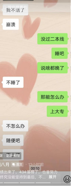 不管是微博,还是各种短视频平台,类似的新闻数不胜数。十年寒窗,考出这样的成绩,他们无愧于自己多年的努力,当然值得高兴和庆贺。只是,社交平台锣鼓喧天,总让人有一种错觉:好像这批高考的孩子,全部都考上了。2023年,全国高考报名人数,有1291万人,而我们看到的那些报喜的分数连百分之一都不到。在镜头对准上岸的孩子们时,我更想说说,背后这群数量庞大的、失落的同学们。今天听家里人说,一个堂妹,考了636的高分,985算是稳了。另一个,在复读还是走向社会的选择中,不知何去何从。同一个家族群里,在满屏的祝贺声中,小侄女的沉默,显得格外令人揪心。我们的教育,好像只教会孩子高考是人生的重要转折点。却没教过他们,一旦这个转折点没能跨过,他们今后的人生,该怎么走?所以,那个差4分没考上大专的孩子,查到成绩后,失声痛哭。但是人生往往有时候会事与愿违,只要我们努力过,就要学会去坦然面对那个最坏的结果。对每一个普通考生来说,这次高考真的是“千军万马过独木桥”。首先,是高考人数比去年还多了近100万,竞争更加激烈。条件和物资的限制,对想要弯道超车的学生来说,又是当头一棒。他们几乎赶上了所有艰难的时刻,却无法避免,要迎接接踵而至的挑战。“复读又差10分,二复还是大专纠结死。网上看到就快速滑走,真的看见他们考的数字就难受得要命。”“出成绩后,眼睛都哭肿了。明明模考很高的科目却很低,接受不了自己的平庸,好难受。”不用外界的责备,不必看到各种失落的眼神,那个考砸的孩子,早已在心中自责了无数遍。之前看过一个视频,女孩发现自己考砸了后,忍不住对着妈妈崩溃大哭:我考砸了……在他们心中,三年的努力,付诸东流,他们才是最失落和委屈的那个人。哭了不知道多少个夜晚,有时候吃饭吃着吃着就掉下眼泪……”不甘、悔恨、自责……种种情绪纠缠在一起,将他们拖入痛苦的深渊。无法面对老师和父母,内心无比愧疚,甚至产生自厌自弃情绪。他们同样披星戴月地学习,写过的试卷习题册也满满一摞。或许是因为学习方法,或是因为考场心态,或许是身体等不可控的原因,又或许是天赋的高下。考得好,那么孩子大概率是要去报效国家的,考得差,那么这个孩子很有可能是回来给你报恩的。不管是成龙成凤,还是平凡地过一生,我们的孩子,只要平安健康就好。比起将所有的期望寄托在孩子身上,不如我们多去关注自身的成长和兴趣。我们这一代父母,一定要懂得,孩子的人生,是他自己的,他们有能力,也有担当为自己负责。正如一位妈妈,十分豁达地表示:孩子高考落榜了,经营多年的水产生意有了接班人。小小的果果问妈妈:如果我考上清华和北大,妈妈你会怎样?妈妈非常认真地告诉他:如果你把地瓜烤得又软又糯,香甜可口的话,那妈妈也一样会为你骄傲的。社会常常教导孩子:要考名校,要出人头地,但没人教育没有考上的人怎么办?高考,只是人生的一个阶段。一次失利,不代表永远的失败。那个考砸的孩子,只要尽全力拼搏过,也就对得起多年的努力了。我清晰地记得,出成绩那天的每一个细节。记得每个清晨与黄昏,我奔跑着去教室学习的场景。我不甘心,付出了这么多努力,却没能收获想要的结果,甚至产生过摆烂的念头。我觉得自己整个人就像失去灵魂一样,处于极度的悲伤和麻木之中。后来的暑假,我跟着父亲去他所做事的工地,找了一份差事。毒辣的太阳,晒化了我心中的委屈和堕落,每天笨重的体力活,也让我渐渐明白一个道理:高考的失利,并不代表人生的失利,而你如果一直沉浸在这个里面,那么你的人生也就这样了。高考这场战斗,我没能打赢,但人生还有很多仗,我不能投降啊。很快我就选择放弃复读的念想去读一所普通的大学,然后在大学里面继续努力。在大学期间,我拼了命学习,除此之外,我还做兼职,给家里减轻负担。大学毕业后我以优异的表现成功入职航空公司,待了一年之后我发现这一眼望到头的工作不是我想要的,然后果断选择辞职。辞职后,我又尝试过很多行业,后来兜兜转转做了自媒体,这样一干就是8年。所以,当我现在回过头去看当初那个高考失利、悲痛欲绝的暑假,发现那只是眼中的一粒沙而已,而我当时却因为那一粒沙而看不见整个天空。我知道,现在依然有很多孩子沉浸在高考考砸的阴霾中。高考确实很重要,重要到,它是普通孩子改变命运的一场战斗。可是人生的路还很长,改变命运的,也不止这一场考试。人生,可不止这一片什刹海,外面还有更广阔的天空等着咱。PS. 碎片化时代,更文不易,欢迎在文章结尾给我们点一个【赞】+【在看】,你的支持就是我们前行的动力!看更多走心好文章
