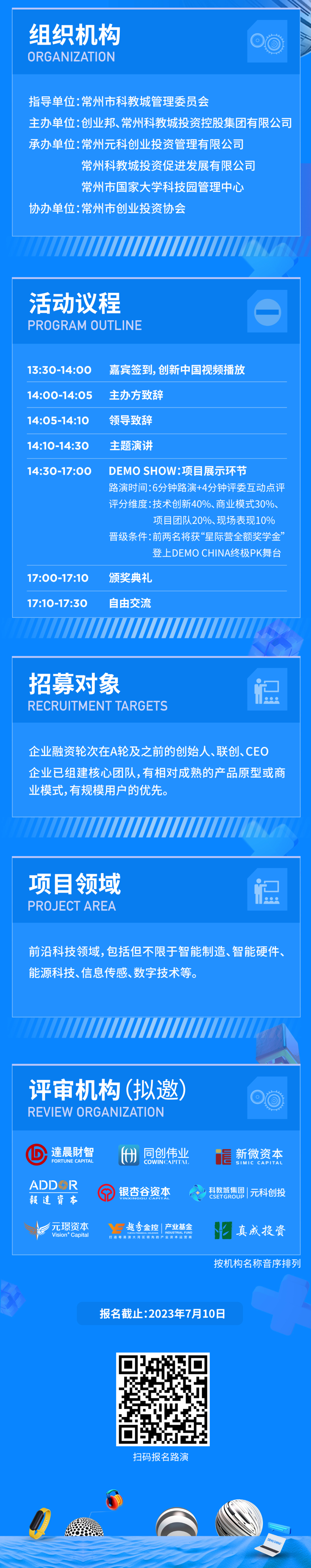 在全国乃至全球的新能源产业版图上,常州迅速崛起成为中坚力量:2022年全市新能源产业规模突破5000亿元,新能源产业集聚度全国第五、投资热度全国第一。常州科教城作为常州的“创新之核”和产业培育新高地,近年来通过打造产教融合共同体、建设公共研发平台等举措集聚高端人才,为建设“新能源之都”提供强劲支撑。为进一步发掘能源科技等前沿科技领域的高潜力项目及人才,凝聚创新力量,为常州新能源之都建设“蓄能充电”,7月11日,在常州市科教城管理委员会指导下,由创业邦、常州科教城投资控股集团有限公司主办,常州元科创业投资管理有限公司、常州科教城投资促进发展有限公司、常州市国家大学科技园管理中心承办,常州市创业投资协会协办的“2023 DEMO CHINA创新中国峰会城市巡回赛-常州前沿科技专场”将在常州拉开帷幕。DEMO CHINA创新中国峰会是创业邦传承十余年的品牌活动,自2007年由美国引进中国,始终走在创新风口前沿,16年间共有1500位国内外顶级投资人到场助阵,累计报名企业超4万家,3000余家优秀企业登台展示,其中不乏能源科技、智能制造、数字技术等前沿制造领域优质项目。为更好地服务全国优质项目,创业邦将在2023 DEMO CHINA创新中国峰会举办之前,聚焦前沿科技、绿色科技、先进制造、新型商业、生命科学五大赛道,先后走进宁波、成都、南通、常州、上海、无锡6大城市,通过城市巡回赛的形式,赋能优质企业成长,助力它们从城市走向更大DEMO舞台。“常州前沿科技专场活动”拟邀达晨财智、同创伟业、新微资本、毅达资本、银杏谷资本、元璟资本、元科创投、越秀产业基金、真成投资等十余家知名投机构担任评审及交流嘉宾,共同见证15位创业者的追梦时刻。通过评审的企业,将获得创业邦星际营全额奖学金,获得多家投资机构联盟联合加速,并有机会登上DEMO CHINA创新中国总决赛舞台,获得品牌宣传的飞跃提升及更多知名创投机构的关注和投资。欢迎智能制造、智能硬件、能源科技、信息传感、数字技术等前沿科技领域企业踊跃报名!期待企业在本次活动中展现自我、收获成长,最终一路过关斩将,通向DEMO CHINA舞台,赢得面向100+顶级投资人路演的机会。