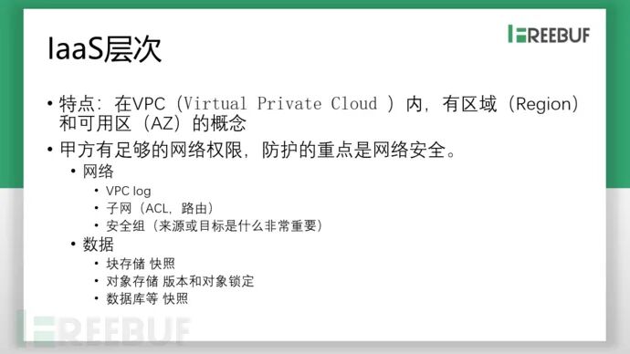 IaaS层次跟IDC 比较相似,它有VPC的概念,等于所有的资源都是在一个虚拟的私有网络里边。作为甲方有足够的网络权限的话,那么防护重点是网络安全。