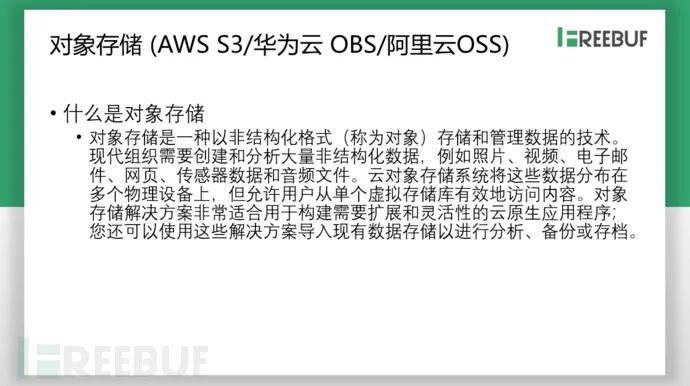 云上特色服务最重要的是对象存储,几乎所有的公有云和私有云都有对象存储的服务。对象存储是一种以非结构化格式(称为对象)存储和管理数据的技术。现代组织需要创建和分析大量非结构化数据,例如照片、视频、电子邮件、网页、传感器数据和音频文件。