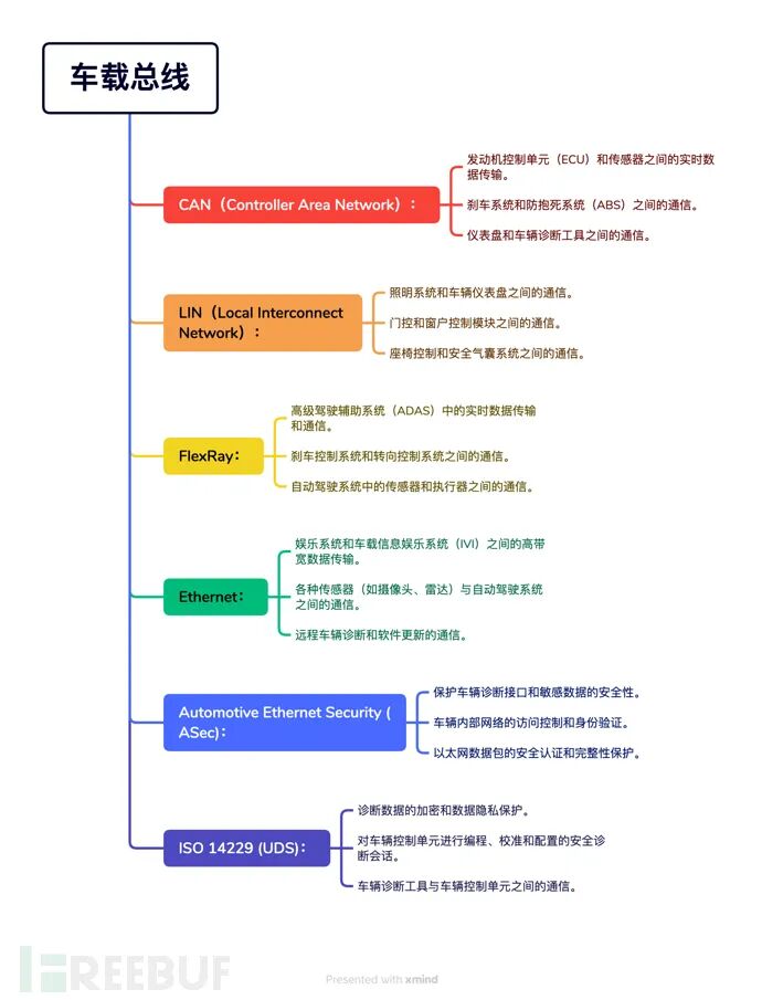 技术学习:特斯拉 Autopilot的实验性安全研究:https://keenlab.tencent.com/zh/2019/03/29/Tencent-Keen-Security-Lab-Experimental-Security-Research-of-Tesla-Autopilot/车载总线是指在汽车中用于不同电子设备之间进行通信和数据传输的一种系统。它扮演着汽车电子系统中重要的角色,实现了各个部件之间的互联和协作。以下是关于车载总线学习的一些总结要点:- 车载总线类型:常见的车载总线类型包括CAN总线(Controller Area Network)、LIN总线(Local Interconnect Network)、FlexRay总线、Ethernet等。每种总线具有不同的特点和适用场景。