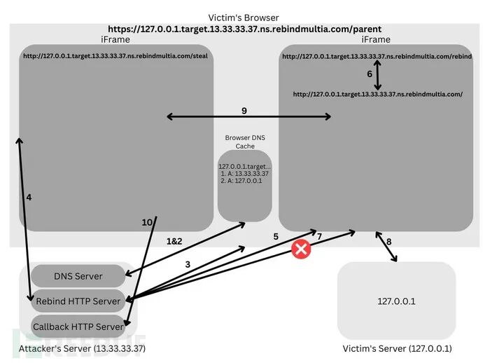 多重A记录重绑定攻击是DNS重新绑定的一种变体,它能够允许攻击者在响应DNS请求时使用两个IP地址进行响应,并让浏览器在第一个IP没有响应时回退到DNS响应中的第二个IP。在此次攻击中,攻击者将配置一个恶意DNS服务器和两个恶意HTTP服务器。DNS服务器将使用两个A记录进行响应: