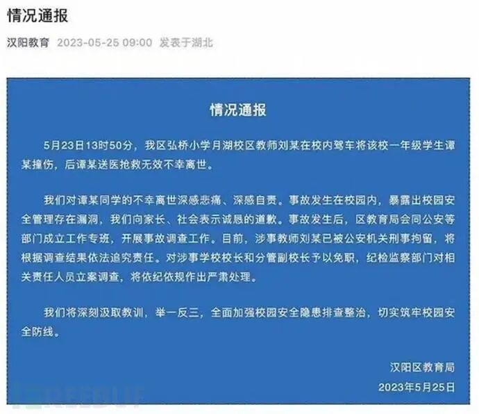 近日热搜榜上出现了一则十分令人心痛的消息:武汉某小学学生在校内被老师刘某驾车撞伤后不幸离世。
